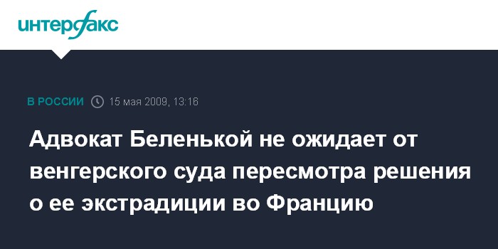Москва. 15 мая. INTERFAX.RU - Окончательное решение венгерского суда по вопросу экстрадиции Ирины Беленькой во Францию будет объявлено в понедельник, и скорее всего, прежнее решение об экстрадиции не будет изменено, заявил адвокат россиянки Роберт Фридман.