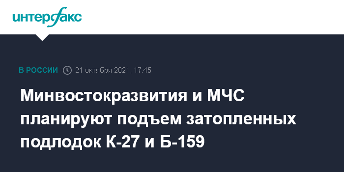 Москва. 21 октября. INTERFAX.RU - Подъем и утилизация затопленной аварийной атомной подводной лодки К-27 и затонувшей атомной подводной лодки Б-159 с отработавшим ядерными топливом планируется при координации с МЧС. Об этом сообщила советник главы Минвостокразвития Ольга Смирнова в ходе совещания по подведению итогов опытно-исследовательского учения по защите Арктики от чрезвычайных ситуаций.