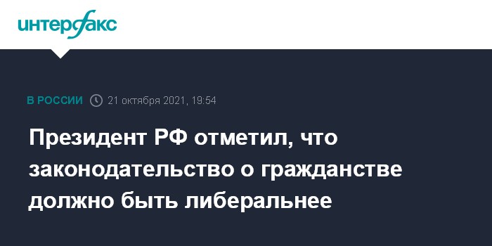 Москва. 21 октября. INTERFAX.RU - Президент РФ Владимир Путин заявил о необходимости либерализации процедуры получения российского гражданства.