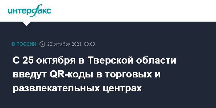 Москва. 21 октября. INTERFAX.RU - В Тверской области с 25 октября будет введена система предъявления QR-кодов при посещении ряда объектов, сообщил губернатор региона Игорь Руденя в прямом эфире на телеканале "Россия 24" Тверь".