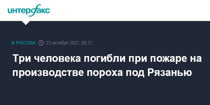 Москва. 22 октября. INTERFAX.RU - В Рязанской области горит цех по производству пороха, погибли три человека.