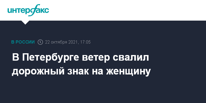 Москва. 22 октября. INTERFAX.RU - В Петербурге на проспекте Стачек 32-летняя женщина пострадала при падении дорожного знака, который повалило ветром. Об этом сообщили в городском управлении МЧС, не уточнив, каково состояние пострадавшей.