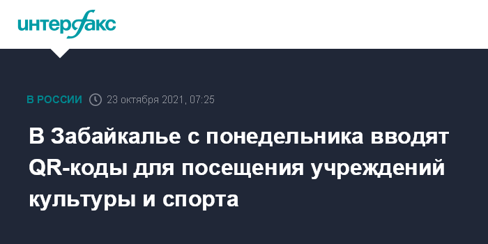 Москва. 23 октября. INTERFAX.RU - В Забайкальском крае вводят посещение общественных мест по QR-кодам с 25 октября. Соответствующее постановление подписал в субботу губернатор Забайкальского края Александр Осипов.