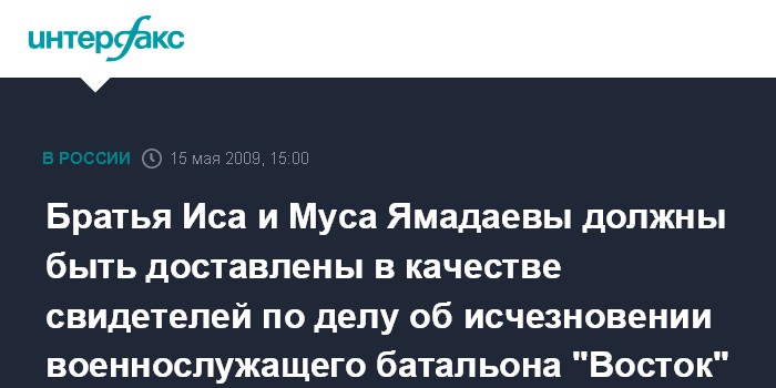 Москва. 15 мая. INTERFAX.RU - Братья Ямадаевы - Иса и Мусса должны быть найдены и доставлены для допроса в качестве свидетелей по делу об исчезновении военнослужащего батальона "Восток". "Сегодня в МВД РФ по Чеченской республике следователем Гудермесского межрайонного следственного отдела направлено поручение об установлении местонахождения братьев Исы и Мусы Ямадаевых и об обеспечении их явки для допроса по делу об исчезновении Алихана Халадова", - сообщил по телефону "Интерфаксу" в пятницу официальный представитель Следственного управления СКП РФ по Чеченской республике.