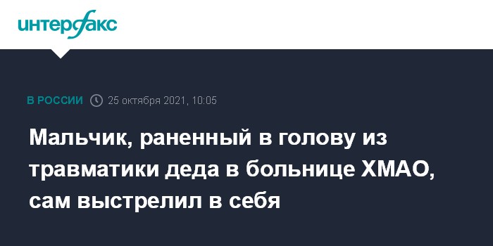 Москва. 25 октября. INTERFAX.RU - Десятилетний мальчик, раненный в голову из травматики своего деда в детской больнице Нижневартовска (Ханты-Мансийский автономный округ), сам случайно применил оружие, сообщил "Интерфаксу" официальный представитель управления СКР по ХМАО Денис Волощенко.
