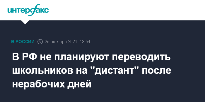 Москва. 25 октября. INTERFAX.RU - Министерство просвещения РФ не планирует переводить школьников на дистанционное обучение после объявленных в стране нерабочих дней, сообщил журналистам глава ведомства Сергей Кравцов в понедельник.