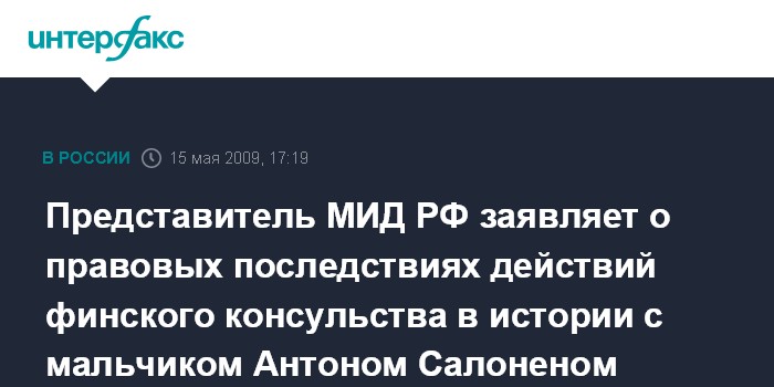 Москва. 15 мая. INTERFAX.RU - В Москве заявляют, что роль, которую сыграло финское генконсульство в истории с вывозом в Финляндию шестилетнего Антона Салонена, будет иметь правовые последствия.