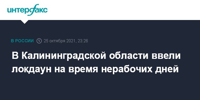 Москва. 25 октября. INTERFAX.RU - Правительство Калининградской области объявило о введении нерабочих дней с 28 октября по 7 ноября, а также об ограничениях на работу предприятий общепита, розничной торговли, развлекательных и других объектов в этот период.