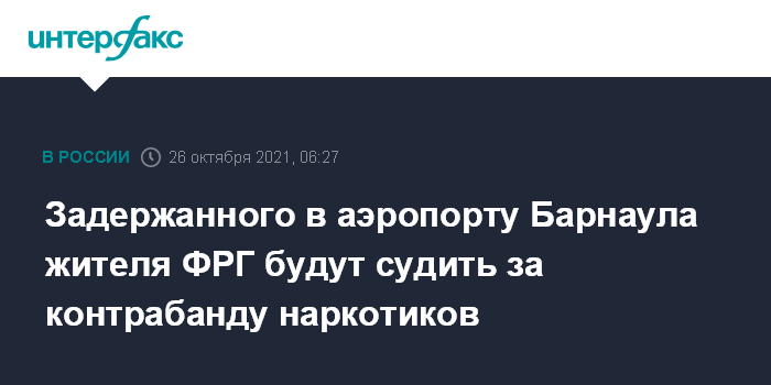 Москва. 26 октября. INTERFAX.RU - Житель Германии, задержанный пограничниками и таможенниками в аэропорту Барнаула, предстанет перед судом за контрабанду наркотиков, сообщает Западно-Сибирская транспортная прокуратура.