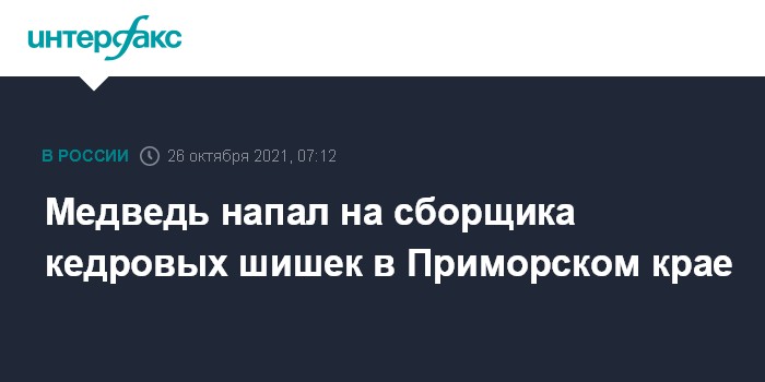 Москва. 26 октября. INTERFAX.RU - Сборщик кедровых шишек пострадал от нападения медведя в лесу, мужчина с рваными ранами лица попал в больницу, сообщает пресс-служба правительства Приморского края.