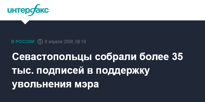 Севастополь. 8 апреля. INTERFAX.RU - В Севастополе собрано более 35 тысяч подписей за отставку председателя Севастопольской городской государственной администрации Сергея Куницына и его команды.