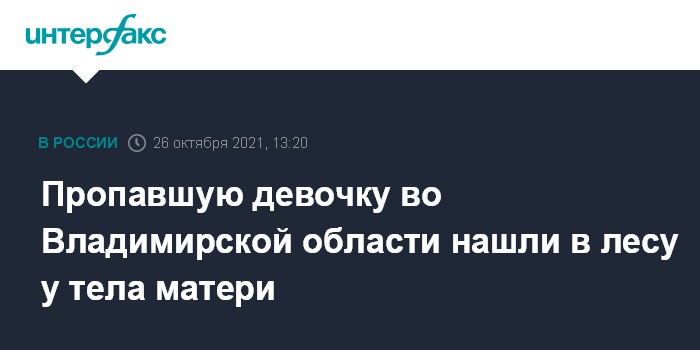 Москва. 26 октября. INTERFAX.RU - Десятилетняя девочка, пропавшая в воскресенье во Владимирской области, найдена живой в лесу, ее мать погибла, сообщает управление СКР по региону.