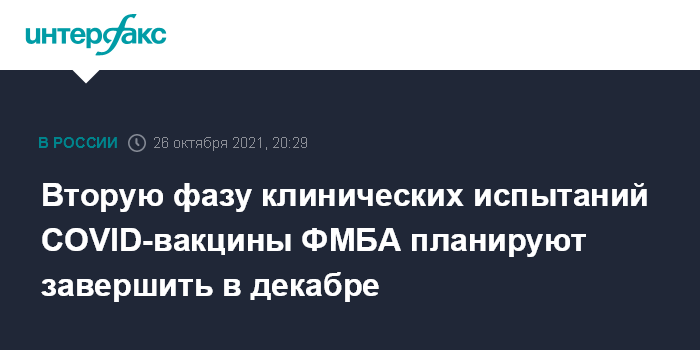 Москва. 26 октября. INTERFAX.RU - Завершение второй фазы клинических испытаний субъединичной вакцины против коронавируса Федерального медико-биологического агентства (ФМБА) запланировано на декабрь этого года, заявка на регистрацию препарата будет подана в Минздрав РФ по ее итогам, сообщила во вторник пресс-служба агентства.
