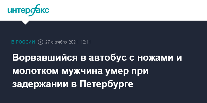 Ворвавшийся в автобус с ножами и молотком мужчина умер при задержании в Петербурге