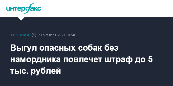 Москва. 28 октября. INTERFAX.RU - Владельцам потенциально опасных собак будет грозить штраф до пяти тысяч рублей за выгул животного без намордника и поводка.