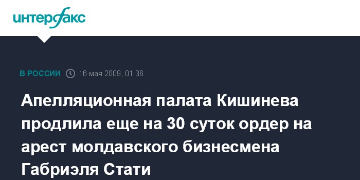 Кишинев. 16 мая. ИНТЕРФАКС - Апелляционная палата Кишинева продлила еще на 30 суток ордер на арест известного молдавского бизнесмена Габриэля Стати. Решение вынесено поздно вечером в пятницу по требованию Генеральной прокуратуры Кишинева, которая обвиняет Г.Стати и его охранника Аурела Маринеску в попытке узурпации власти и организации массовых беспорядков.