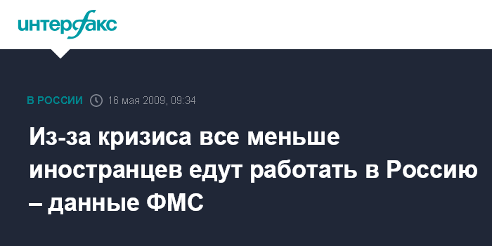 Москва. 16 мая. ИНТЕРФАКС – В Федеральной миграционной службе (ФМС) России отмечают, что на фоне финансового кризиса снижается число иностранцев, которые едут в Россию, в том числе в поисках работы.
