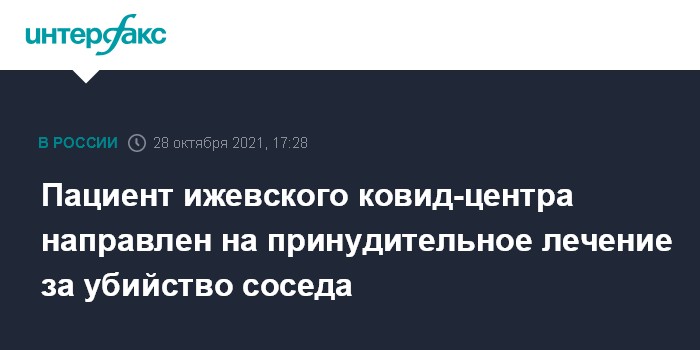 Москва. 28 октября. INTERFAX.RU - 35-летний житель Ижевска признан виновным в убийстве соседа по палате в ковид-больнице в мае прошлого года. Суд направил его на принудительное психиатрическое лечение, сообщила прокуратура Удмуртии.