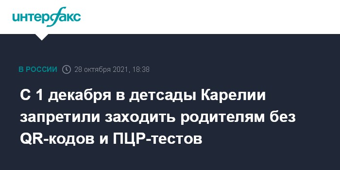 Москва. 28 октября. INTERFAX.RU - С 1 декабря родителям при посещении детского сада или школы будет необходимо предъявить QR-код, справку о вакцинации или отрицательный ПЦР-тест, написал на своей странице в соцсети "ВКонтакте" глава республики Артур Парфенчиков.