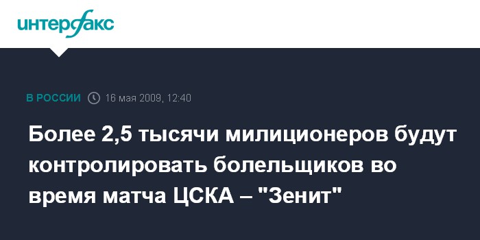 Москва. 16 мая. INTERFAX.RU - Охрану общественного порядка во время матча девятого тура чемпионата России по футболу ЦСКА - "Зенит" (Санкт-Петербург), который пройдет в воскресенье в Москве, будут обеспечивать свыше 2500 сотрудников милиции, сообщили "Интерфаксу" в управлении информации и общественных связей ГУВД Москвы.