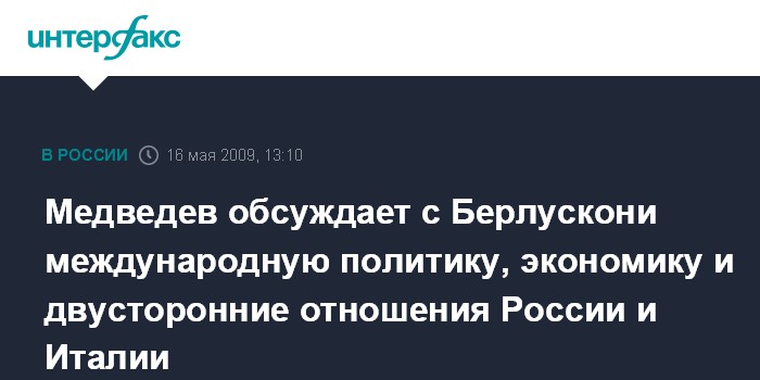 Медведев обсуждает с Берлускони международную политику, экономику и двусторонние отношения России и Италии