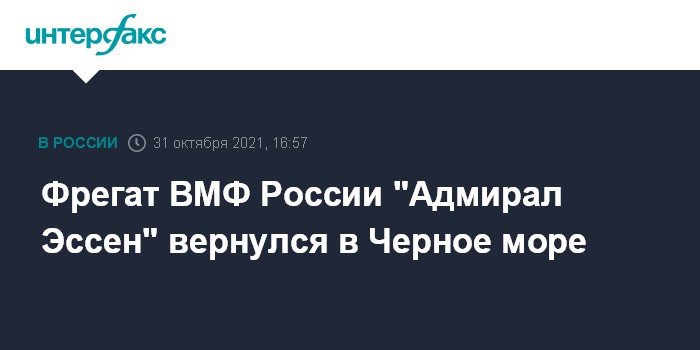 Москва. 31 октября. INTERFAX.RU - Российский фрегат "Адмирал Эссен", оснащенный крылатыми ракетами большой дальности "Калибр", в воскресенье после 85-дневного пребывания в Средиземноморье вернулся в акваторию Черного моря, сообщили в соцсетях стамбульские наблюдатели, публикующие фотографии его прохождения через проливы.