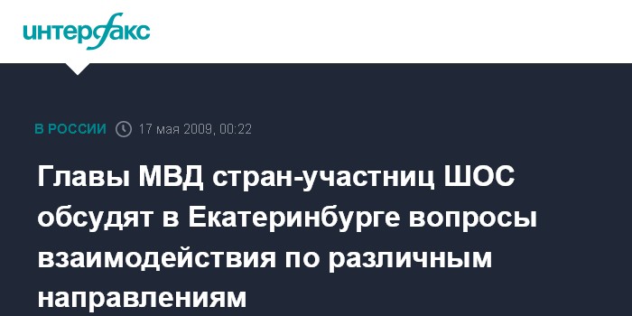 18-19 мая в Екатеринбурге пройдет совещание министров внутренних дел и общественной безопасности государств-членов ШОС, в котором примут участие министр внутренних дел РФ Рашид Нургалиев, министр общественной безопасности КНР, а также главы МВД Казахстана, Киргизии, Таджикистана и Узбекистана.
