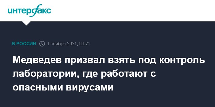 Москва. 1 ноября. INTERFAX.RU - Заместитель председателя Совета Безопасности РФ Дмитрий Медведев заявил о необходимости взять под международный контроль деятельность лабораторий, ведущих изучение смертоносных вирусов.