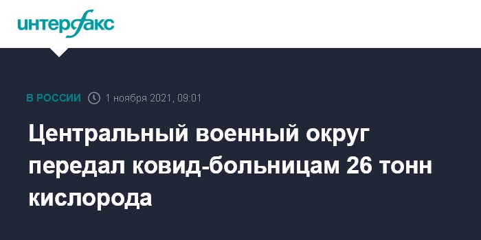 Москва. 1 ноября. INTERFAX.RU - Центральный военный округ передал больницам десяти регионов 26 тонн сжиженного кислорода для помощи больным с коронавирусной инфекцией, сообщила пресс-служба округа.