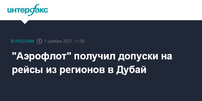 Москва. 1 ноября. INTERFAX.RU - "Аэрофлот" получил допуски к регулярным рейсам из девяти регионов России в Дубай (ОАЭ), следует из приказа Росавиации по итогам заседания межведомственной комиссии при Минтрансе.