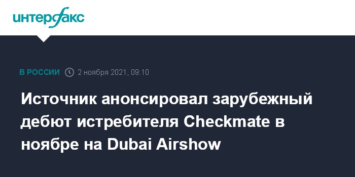 Москва. 1 ноября. INTERFAX.RU - Легкий истребитель пятого поколения Checkmate впервые покажут на зарубежном авиасалоне в ОАЭ, сообщил "Интерфаксу" источник в авиастроительной отрасли.
