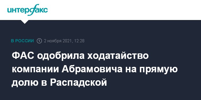 Москва. 2 ноября. INTERFAX.RU - Федеральная антимонопольная служба сообщила, что удовлетворила ходатайство компании Романа Абрамовича Greenleas International (владеет 28,64% в Evraz) о приобретении 26,74% ПАО "Распадская".