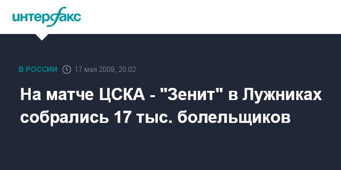 Москва. 17 мая. ИНТЕРФАКС-МОСКВА - На матче девятого тура чемпионата России по футболу между командами ЦСКА и "Зенит", который проходит в воскресенье на стадионе "Лужники", присутствуют 17 тысяч зрителей, сообщили "Интерфаксу" в управлении информации и общественных связей ГУВД Москвы.