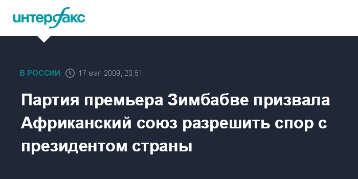 Лондон. 17 мая. ИНТЕРФАКС - Представители Движения за демократические перемены (ДДП), возглавляемого премьер-министром Зимбабве Морганом Цвангираем, призывают лидеров Африканского союза (АС) и Сообщества развития юга Африки (САДК) помочь разрешить конфликт кабинета министров с президентом страны Робертом Мугабе.