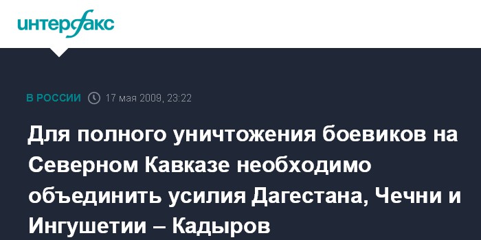 Магас. 17 мая. ИНТЕРФАКС-ЮГ - Президент Чеченской республики Рамзан Кадыров считает, что для полного уничтожения боевиков и решения проблемы вооруженных бандформирований необходимо объединить усилия правоохранительных органов Дагестана, Чечни и Ингушетии.