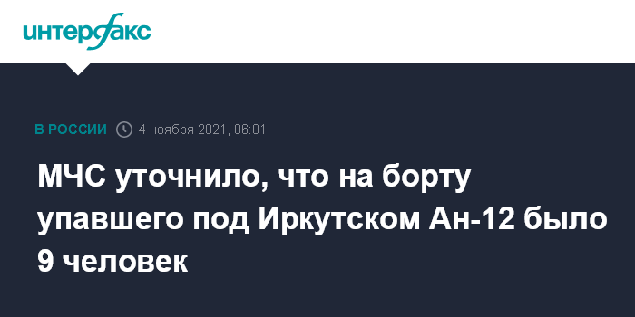 Москва. 4 ноября. INTERFAX.RU - Девять человек находились на борту самолета Ан-12, потерпевшего крушение в Иркутской области в среду вечером, сообщил первый замначальника главного управления МЧС по региону Андрей Рябоволов на заседании комиссии по ЧС.
