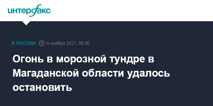 Москва. 4 ноября. INTERFAX.RU - Пожар в тундре в Магаданской области, возникший в 15-градусный мороз, локализован, сообщает пресс-служба МЧС РФ.