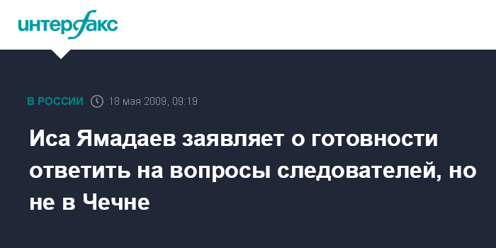 "Нет, туда я на допрос не поеду. Я туда просто не доеду - потеряюсь по дороге, исчезну, еще что-то произойдет Для меня это очевидно. Но я готов дать показания следователям в Москве", - заявил И.Ямадаев в телефонном интервью газете "Известия", публикуемом в номере за 18 мая.