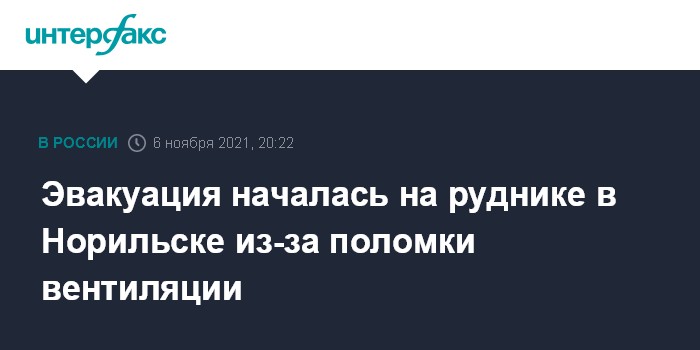 Москва. 6 ноября. INTERFAX.RU - В Норильске на руднике "Заполярный" вышла из строя вентиляционная система, проводится эвакуация, сообщил "Интерфаксу" информированный источник.