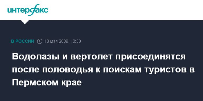 Москва. 18 мая. INTERFAX.RU - Спасатели планируют привлечь водолазов и вертолет к поискам туристов, пропавших 11 мая во время сплава по реке Вильва в Пермском крае. Четыре человека уже найдены погибшими, судьба еще пятерых до сих пор не известна.