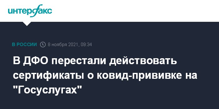 Москва. 8 ноября. INTERFAX.RU - Жители регионов Дальнего Востока начали массово жаловаться, что в их личных кабинетах на портале госуслуг прекратили действие сертификаты о вакцинации от коронавируса, которые должны были действовать год. Региональные чиновники пытаются прояснить ситуацию в федеральных ведомствах.