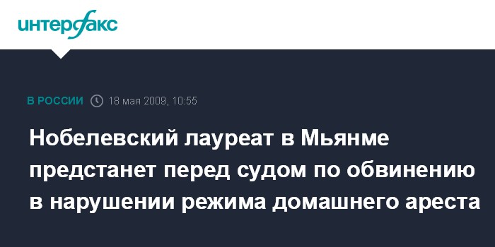 Москва. 18 мая. INTERFAX.RU - Один из лидеров оппозиции Мьянмы (Бирмы) нобелевская лауреатка Аун Сан Су Чжи, отсидевшая под домашним арестом 13 лет из 19 за борьбу против правящего режима, в понедельник предстанет перед судом по обвинению в нарушении режима, сообщает британская телерадиокорпорация Би-би-си.