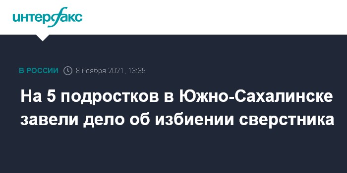 Москва. 8 ноября. INTERFAX.RU - Уголовное дело возбуждено в отношении пятерых подростков по подозрению в избиении своего сверстника в Южно-Сахалинске 3 ноября, после чего тот попал в больницу.