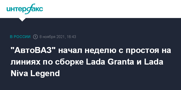 Кроме того, по его данным, простой для сборочного производства Lada Granta может быть введен с 10 по 11 ноября включительно. Также приостановка на день - 11 ноября - может коснуться и линии по сборке Lada Niva Legend.