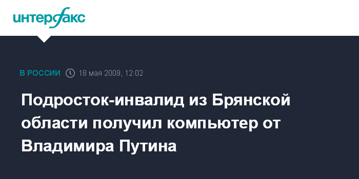 Москва. 18 мая. INTERFAX.RU - Новый компьютер от премьер-министра РФ Владимира Путина вручил мальчику-инвалиду заместитель губернатора Брянской области Рашит Габдулвалеев, сообщили в понедельник "Интерфаксу" в пресс-службе региональной администрации.