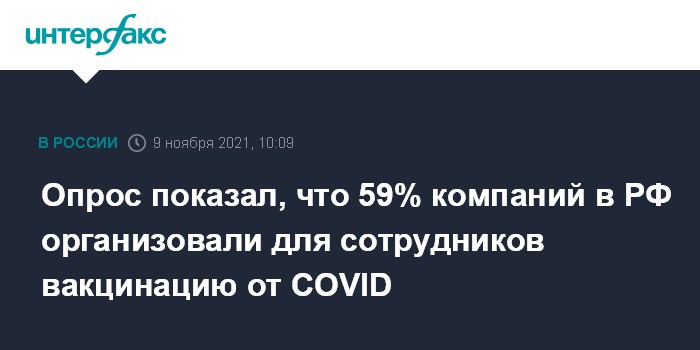 Москва. 9 ноября. INTERFAX.RU - Более половины российских работодателей (59%) организовали для своего персонала вакцинацию от коронавируса, свидетельствуют данные опроса Исследовательского центра портала SuperJob.ru, поступившие во вторник в "Интерфакс".