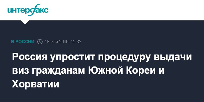 Москва. 18 мая. INTERFAX.RU - Президиум правительства РФ на заседании в понедельник рассмотрит документы, предусматривающие упрощение процедуры выдачи виз между Россией и Южной Кореей, Россией и Хорватией.