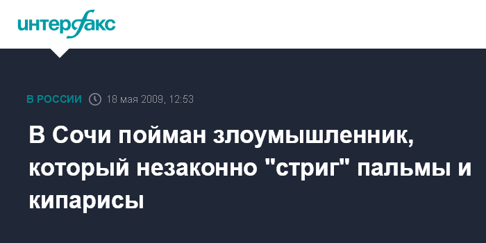 Москва. 18 мая. INTERFAX.RU - В Сочи (Краснодарский край) ранним утром в понедельник задержан мужчина, который под видом работника ЖКХ срезал ветки пальм и кипарисов.