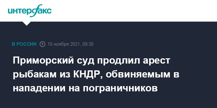 Москва. 10 ноября. INTERFAX.RU - Приморский краевой суд продлил до 19 февраля арест 14 северокорейским рыбакам, которых судят по обвинению в нападении на российских пограничников в 2019 году в Японском море, сообщила "Интерфаксу" пресс-секретарь суда Елена Оленева.