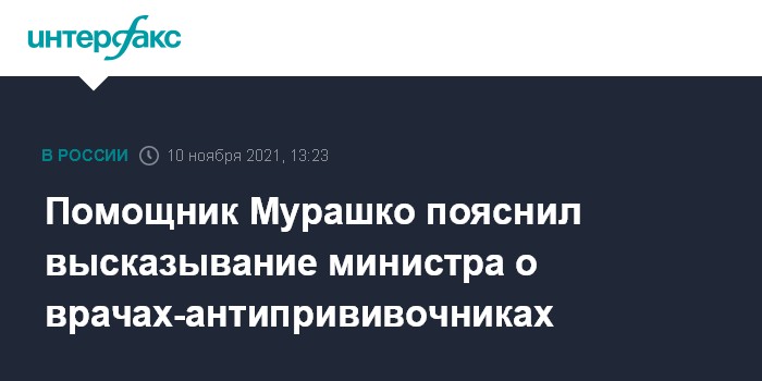 Москва. 10 ноября. INTERFAX.RU - Министр здравоохранения Михаил Мурашко считает, что в действующем законодательстве уже предусмотрены меры ответственности для граждан, в том числе медработников, призывающих к отказу от вакцинации от коронавируса, сказал "Интерфаксу" помощник главы Минздрава Алексей Кузнецов.